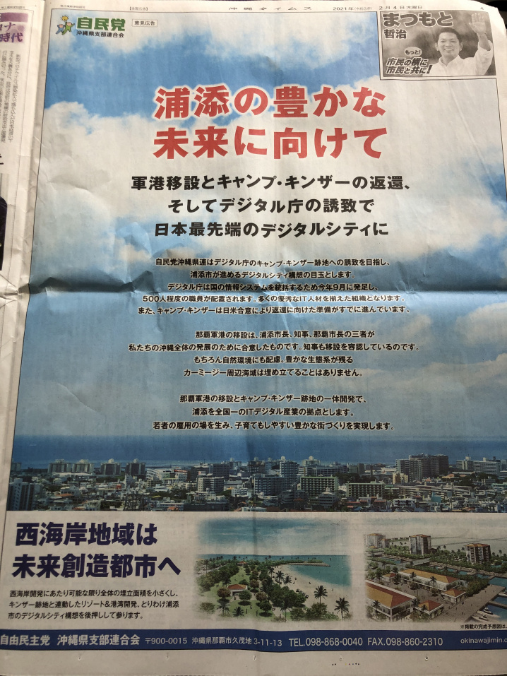 『浦添の豊かな未来に向けて』と言うお題ででかでかと広告を載せました