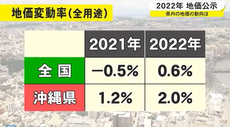2021年は、コロナの影響でギリギリ持ちこたえるのが精いっぱいの地価の上昇でしたが、昨年度の集計結果で沖縄県は全国4位の地価上昇率でした。